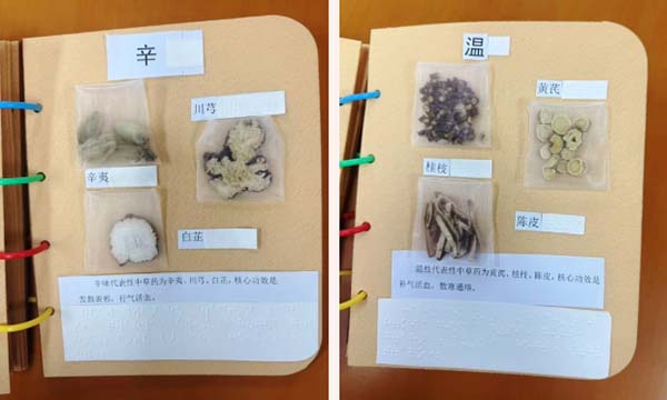 随后,双方青年分工协作,共同制作《四气》《五味》两本中医药多感官盲文图书。中药饮片标本、触感材料与盲文知识相结合,通过精心设计的触觉纹理、卡片,让视障群体能“触摸”中药特性、“闻见”本草气息,将抽象的中医药理论转化为可感知的实体载体。