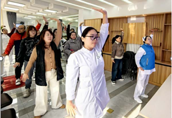 护理团队同样全程暖心服务。邢亮、田婧、冯雪梅三位护士长带领护士们分工有序,一边为居民免费测量血压、发放健康宣教单,一边现场施展中医特色护理技术——依据居民体质辨证施术,精准开展耳穴贴压、穴位贴敷,让大家在亲身体验中直观感受中医药非药物疗法的独特疗效。医护人员还带领居民一同练习八段锦,一招一式间传递中医养生智慧,现场欢声笑语不断,氛围温馨而热烈。