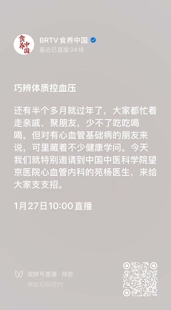 1月27日 10:00丨望京医院专家做客BRTV北京时间《食养中国》为您带来:巧辨体质控血压