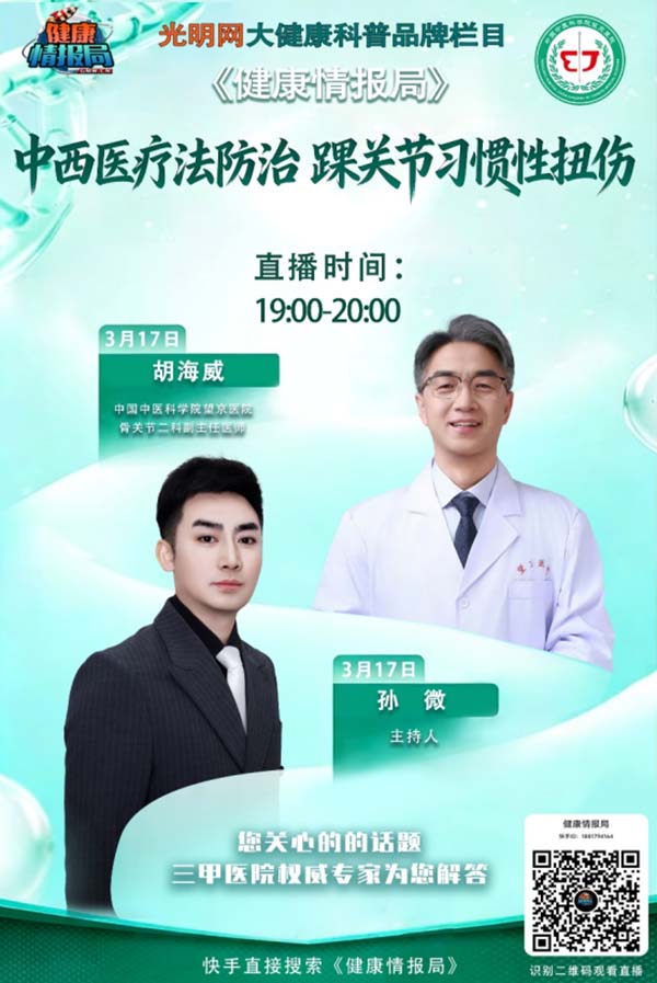 3月17日(周一)19:00,望京医院骨关节二科副主任医师胡海威为您带来:中西医疗法防治,踝关节习惯性扭伤,敬请关注本期精彩直播!