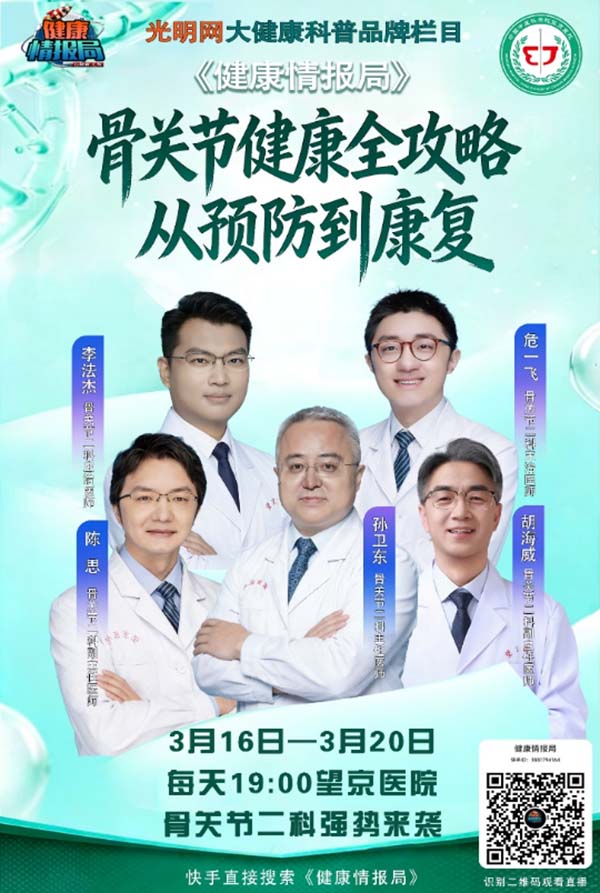 3月16—3月20日,中国中医科学院望京医院骨关节二科团队做客光明网《健康情报局》,为您带来骨关节健康全攻略 从预防到康复系列科普直播。