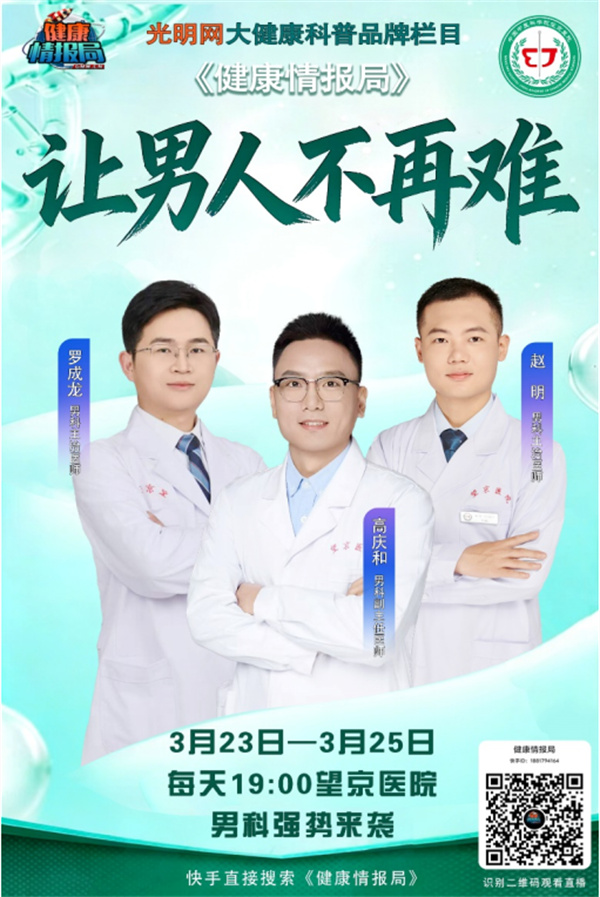 3月23日—3月25日,中国中医科学院望京医院男科团队做客光明网《健康情报局》,为您带来让男人不再难系列科普直播。