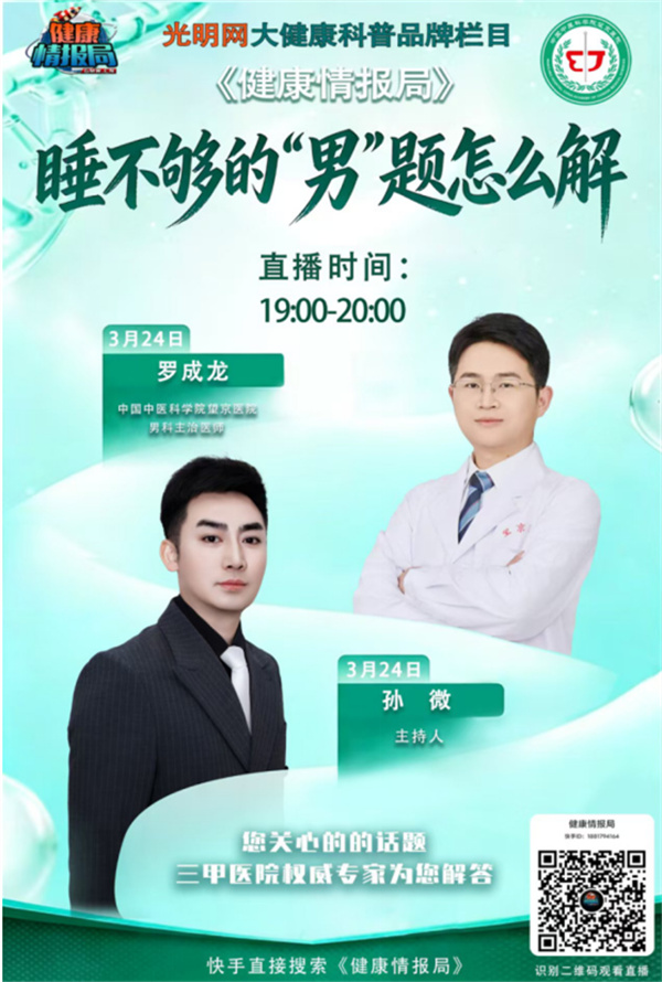 3月23日—3月25日,中国中医科学院望京医院男科团队做客光明网《健康情报局》,为您带来让男人不再难系列科普直播。