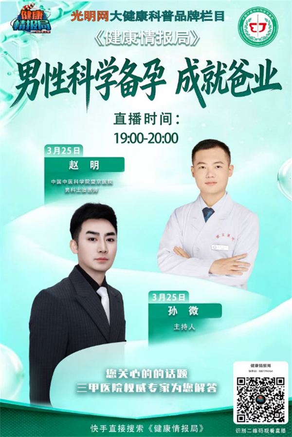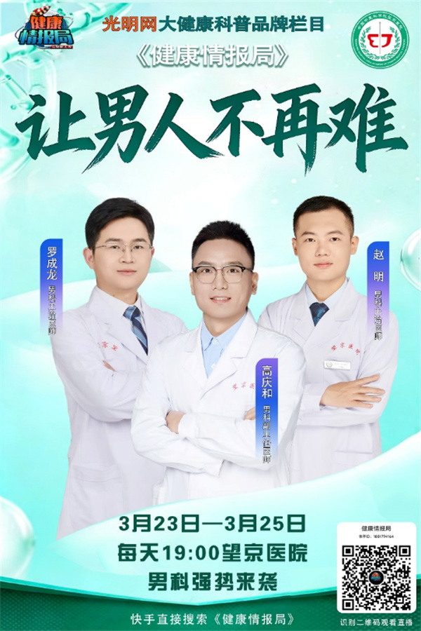 3月23日—3月25日,中国中医科学院望京医院男科团队做客光明网《健康情报局》,为您带来让男人不再难系列科普直播。