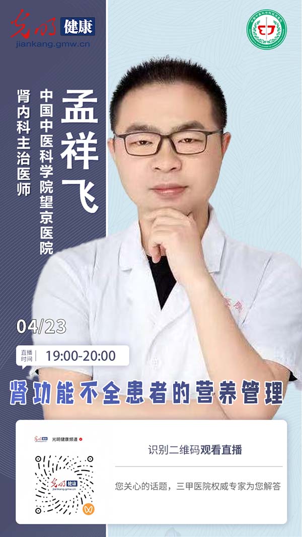 4月23日(周四)19:00,望京医院主治医师孟祥飞为您带来:肾功能不全患者的营养管理。敬请关注本期精彩直播!